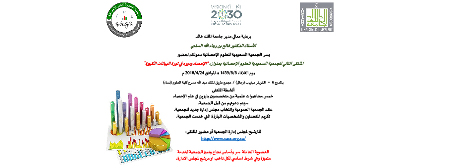 أهلاً بكم في الموقع الرسمي للجمعية السعودية للعلوم الإحصائية (SASS).  برعاية كريمة من معالي مدير الجامعة سعادة الاستاذ الدكتور فالح بن رجاء الله السلميسيعقد ملتقى الجمعية الثاني في رحاب جامعة الملك خالد حيث سيكون عنوان الملتقى (الإحصاء ودورة في ثورة البيانات الكبيرة (والضخمه)) وسيتخلل الملتقى التالي: