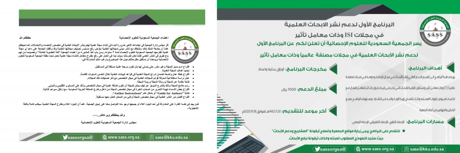 أعلنت الجمعية السعودية للعلوم الإحصائية لأعضائها عن البرنامج الأول لدعم نشر الأبحاث العلمية في مجلات مصنفة عالمياً وذات معامل تأثير، حيث يهدف هذا البرنامج الى تقديم الدعم المالي لنشر الأبحاث في مجال الإحصاء وعلومه في مجلات مصنفة عالمياً (ISI) وذات معامل تأثير، وستكون الأولية للأبحاث التي تركز على ايجاد حلول ذات أثر للتعامل الفعال مع تداعيات فيروس كورونا المستجد وذلك للتصدي لهذا الوباء والحد من انتشاره. يستهدف البرنامج جميع الباحثين والمهتمين من أعضاء الجمعية، وتتركز مسارات البرنامج على الإحصاء النظري، الإحصاء التطبيقي والإحصاء الرسمي.